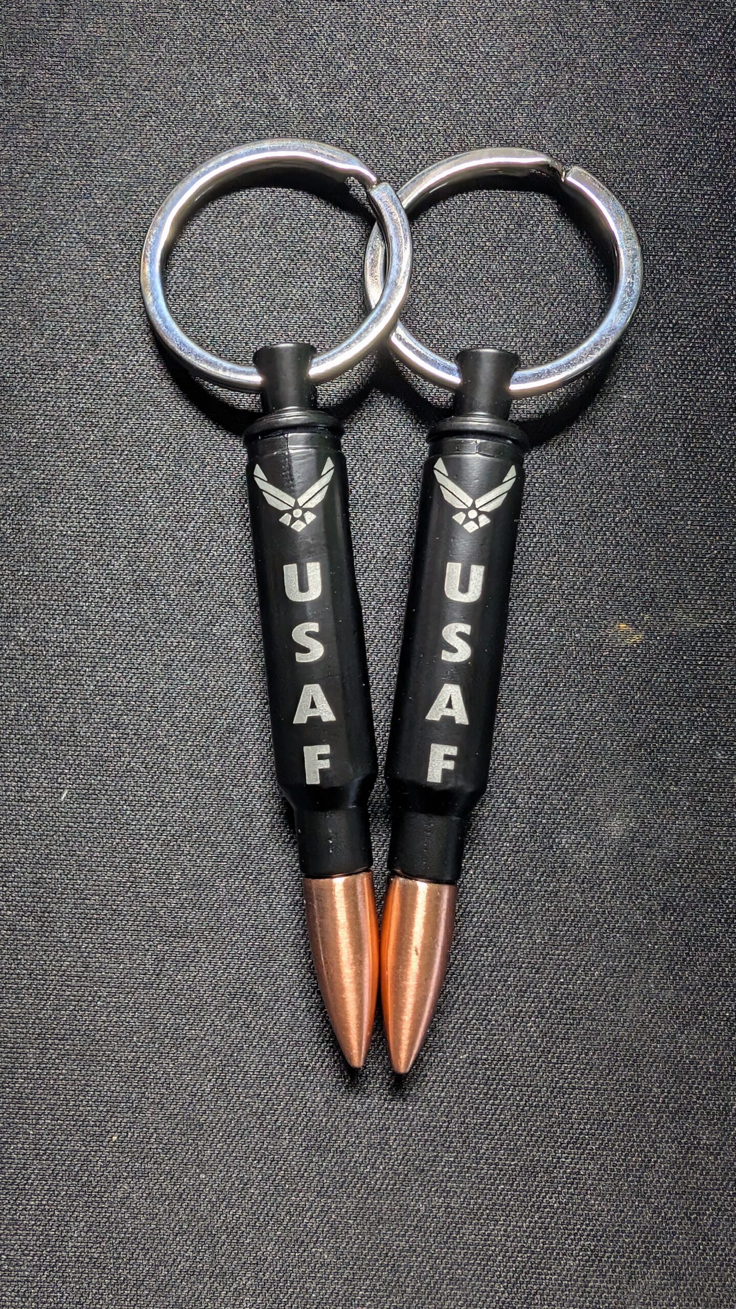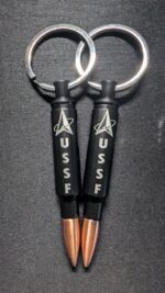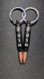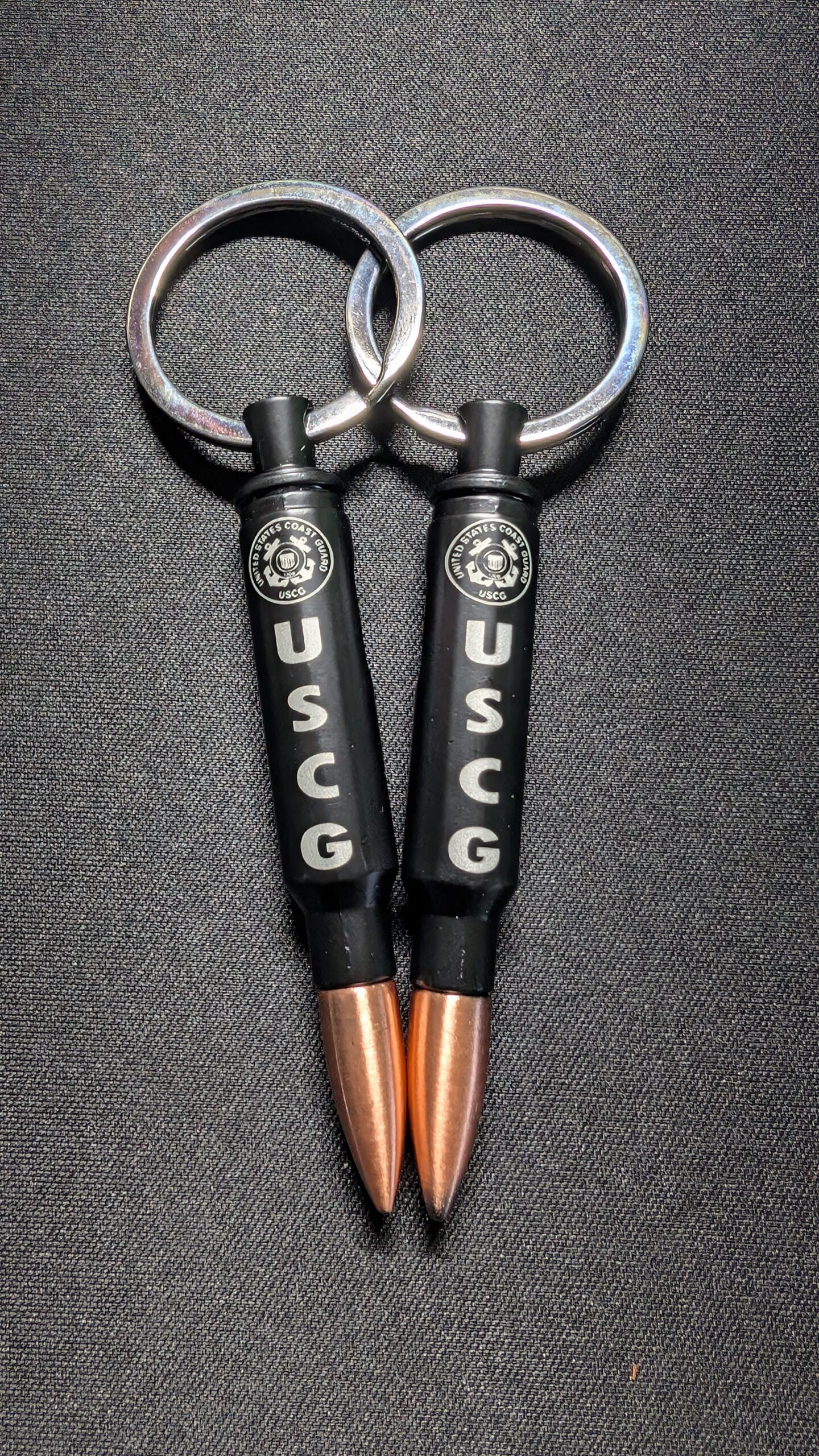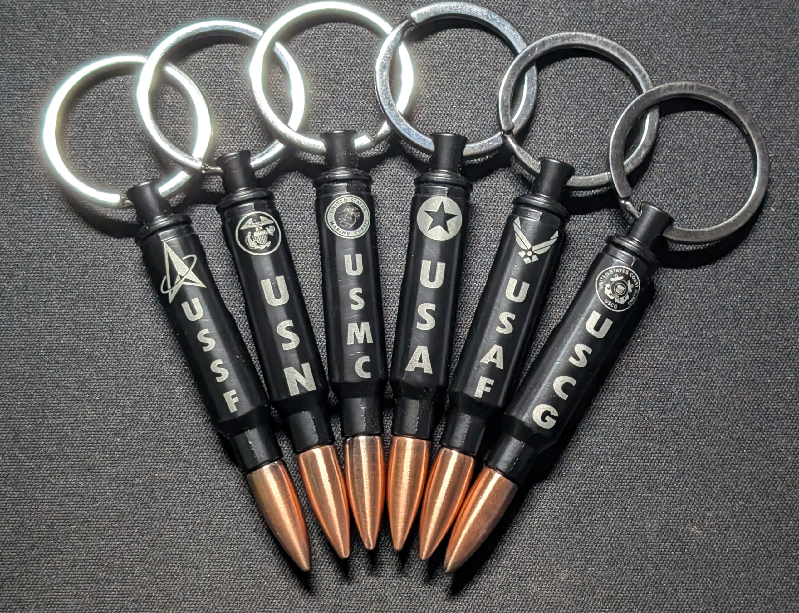 Show your pride and honor with this handcrafted engraved bullet keychain, featuring every branch of the United States Armed Forces. Made from once-fired .50 caliber rounds, these keychains are powder-coated black and deep laser engraved with crisp, high-contrast designs that will last a lifetime.