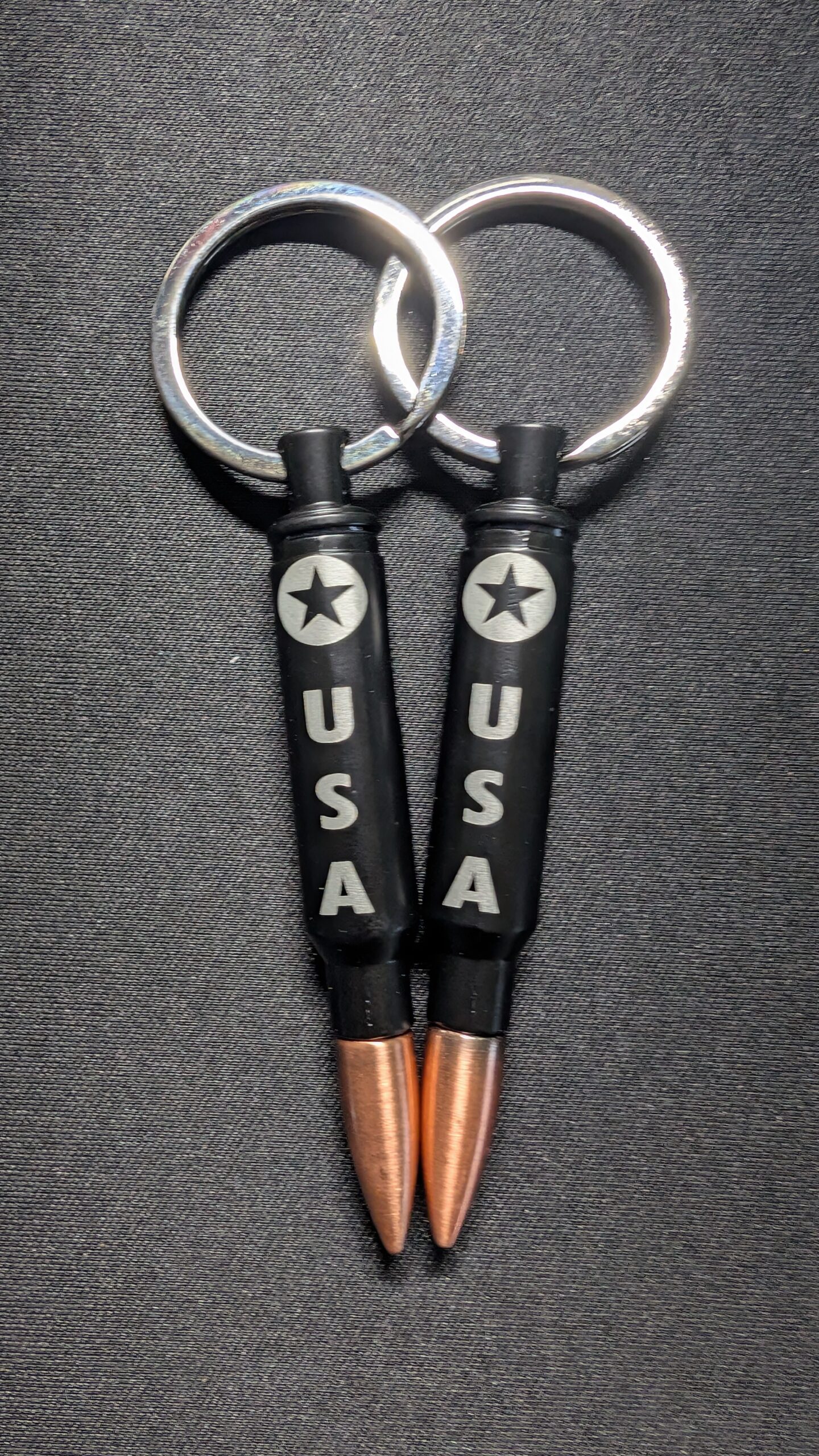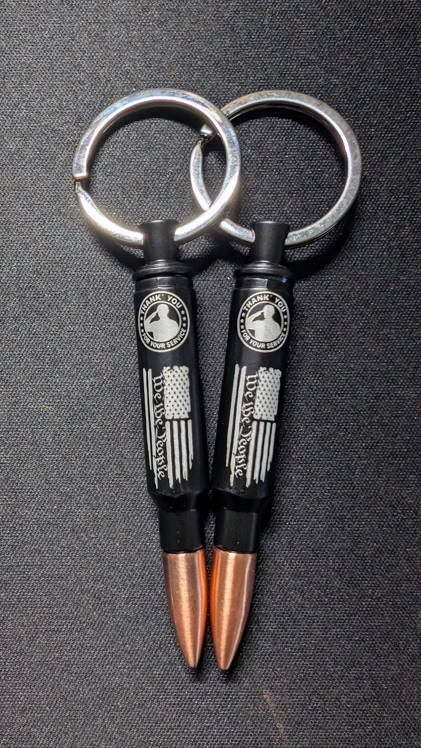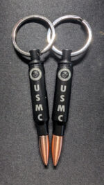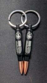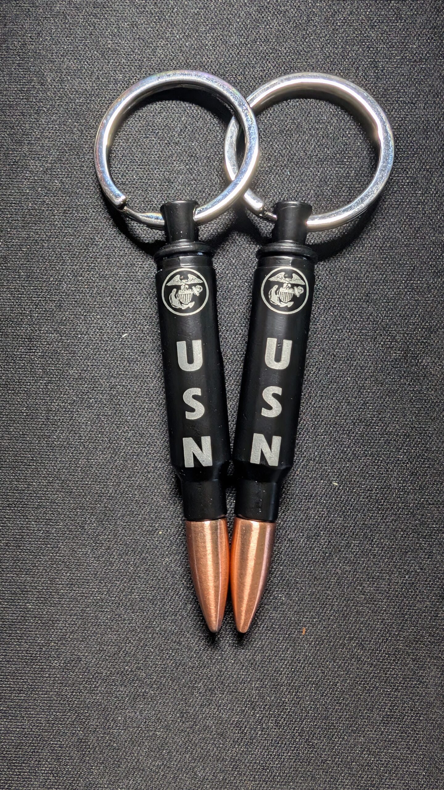 Show your pride and honor with this handcrafted engraved bullet keychain, featuring every branch of the United States Armed Forces. Made from once-fired .50 caliber rounds, these keychains are powder-coated black and deep laser engraved with crisp, high-contrast designs that will last a lifetime.